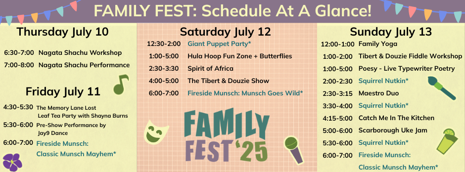 The 2025 Festival starts July 10 with audience favourite Nagata Shachu, bringing their heart-pounding performance and workshops of Taiko drumming and music. From July 11-13 we'll be hosting a special presentation of Fireside Munsch performed by M. John Kennedy and featuring the beloved stories of one of Canada's favourite authors. Over the weekend we'll be welcoming back returning Family Fest artists including The Grand Salto Theatre, Scarborough Uke Jam, Spirit of Africa, Tibert et Douzie, Poesy, and Hoop You and introducing new acts to the stage including Carousel Players, Maestro Duo, and Catch Me in the Kitchen.